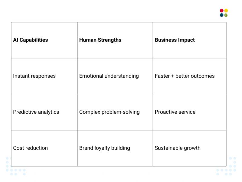 ● AI takes care of routine tasks, responds instantly, and analyzes data for proactive solutions, while humans take care of complex, emotional, or intricate cases—without sacrificing efficiency or providing a personal touch.