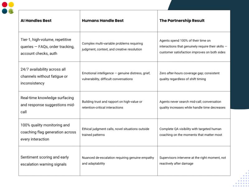 • The AI + human model consistently outperforms full automation — AI handles the predictable; humans handle the emotional and complex.