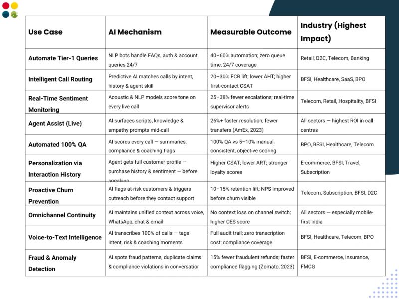 • AI Customer Support changes operations structurally: 100% QA coverage, demand-accurate scheduling, skill-matched routing, and real-time agent assist.