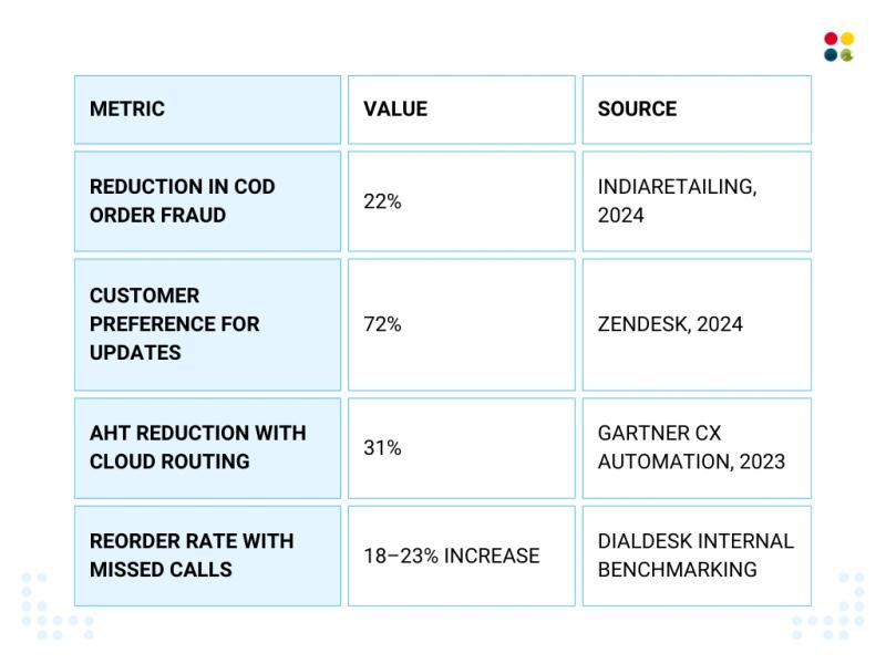 Use Case: An eCommerce retailer auto-dials each high-value order to confirm intent, lowering fraud and COD returns by 22% (Source: IndiaRetailing, 2024).