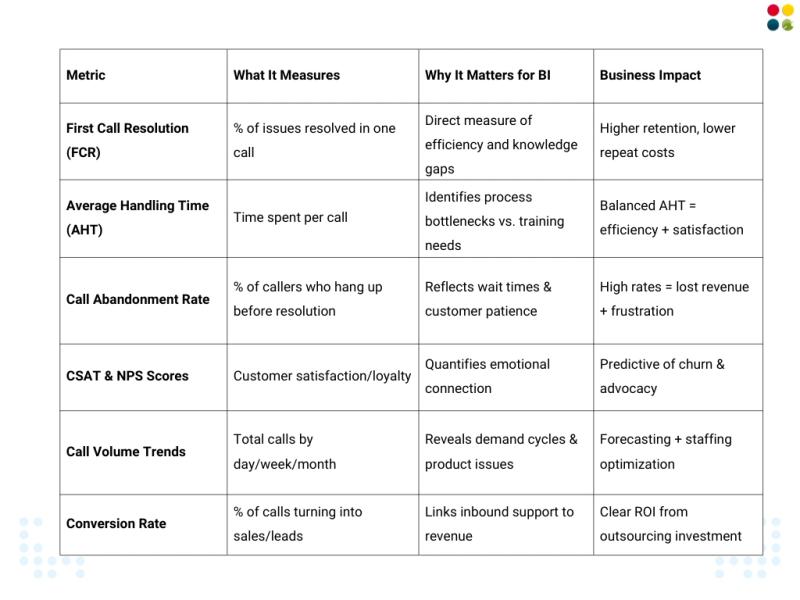 ● The blog highlights top metrics (including First Call Resolution, Average Handling Time, Abandonment Rate, CSAT/NPS, Volume Trends, and Conversion Rate) and provides real-world examples of cost and BI benefits of outsourcing.