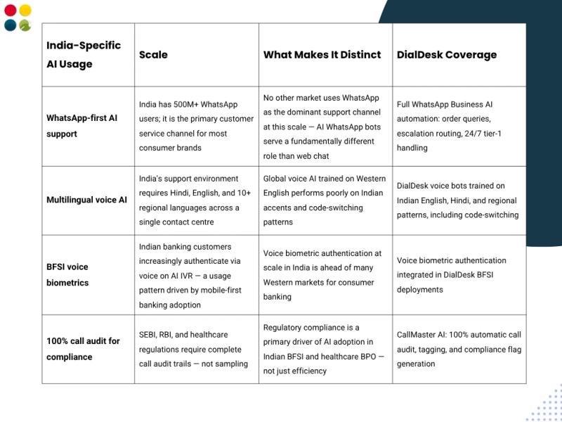 - India-specific AI customer service usage is distinct: WhatsApp-first (not web chat), multilingual voice AI, and compliance-driven 100% call auditing are the primary differentiators from Western deployments.