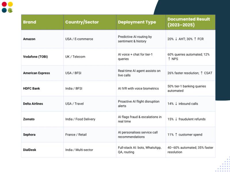These are not case studies commissioned by the vendors. These are publicly documented results from named brands, citing the sources. The purpose is to give CX leaders and decision-makers a clear picture of what AI customer service delivers at scale, across sectors and geographies.