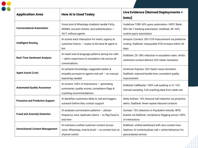 AI is used across 8 live application areas: conversational automation (voice bots + WhatsApp), intelligent routing, real-time sentiment monitoring, agent assist, automated 100% QA, proactive predictive support, fraud detection, and omnichannel context management with documented results from Amazon, Vodafone, HDFC Bank, Zomato, and DialDesk.