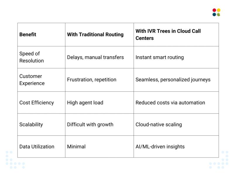 ● It contrasts IVR-powered routing with conventional manual routing, highlighting gains in speed, customer satisfaction, operational expense, scalability, and data-driven insights with AI and ML.