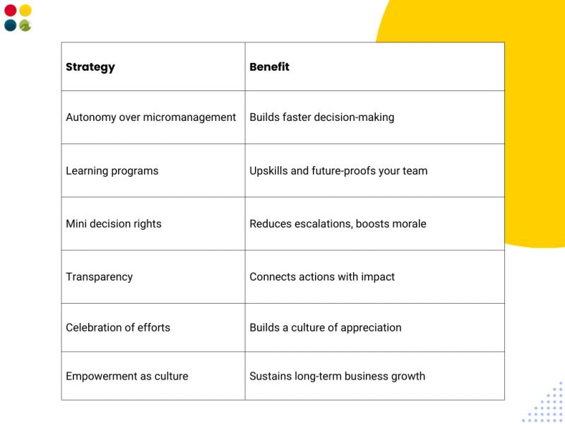 Embed empowerment into onboarding, reviews, and leadership KPIs.