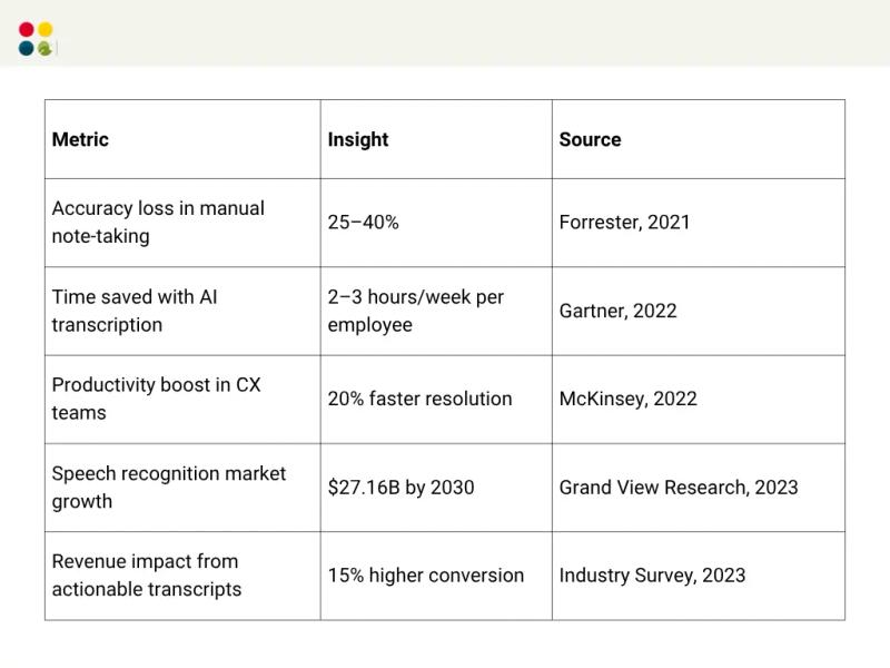 ● Increase Accuracy: Human note-taking tends to miss 25–40% of information (Source: Forrester, 2021).