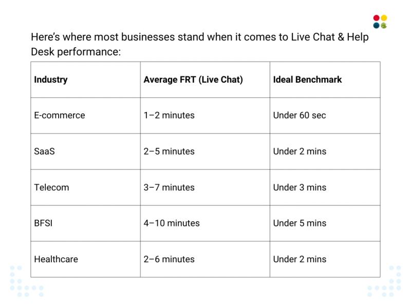 ● This blog discusses the role of First Response Time (FRT) in live chat and help desk operations, detailing how rapid responses create customer trust, analyzing industry standards for average FRT targets, and offering step-by-step guidance on measuring, enhancing, and optimizing response times.