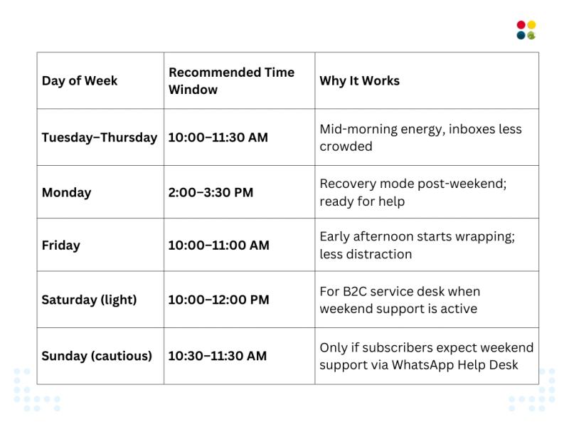 ● It points out research-supported best days and time slots—like mid-mornings during weekdays and certain weekend timeslots—for sending messages through WhatsApp Support, API, or Automation.