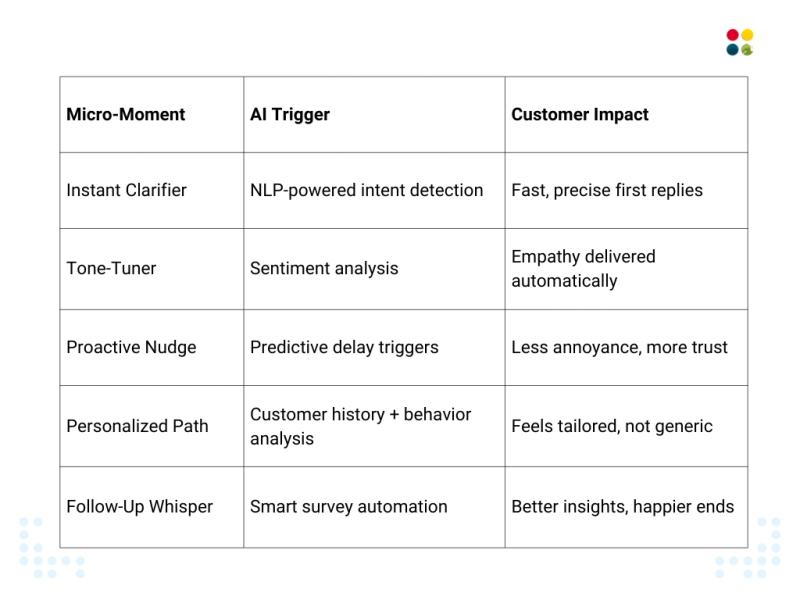 ● Customer experience (CX) micro-moments are short, impactful interactions—such as instant explanation, tone modulation, proactive notifications, customised journeys, and timely reminders—where Customer Service AI can anticipate needs, influence emotional reactions, and make support memorable.