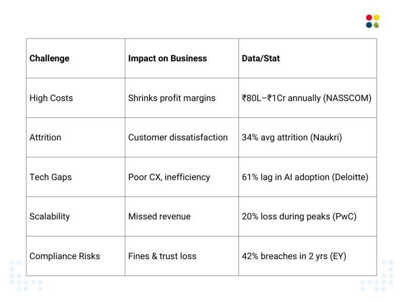 Stat: Operating an in-house call center with 50 agents in India can cost ₹80 lakhs–₹1 crore a year, not including upgrades (NASSCOM).