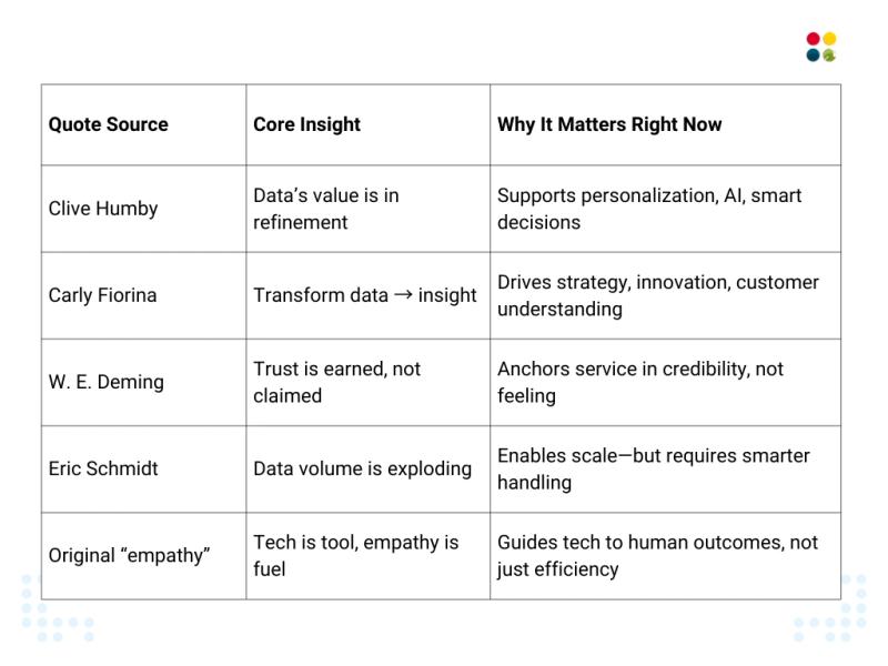We’ve woven together crisp quotes and human-centred commentary to remind us: technology delivers possibilities; service delivers trust. Quotes like Deming’s, Schmidt’s, and Humby’s mark the mind. Empathy marks the heart.