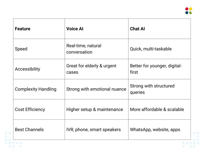 Voice AI and Chat AI are not rivals; they’re complements. One excels when it comes to speed and emotion (imagine emergency customer support calls), while the other is better at multitasking and unobtrusive communication (such as product FAQs via WhatsApp).