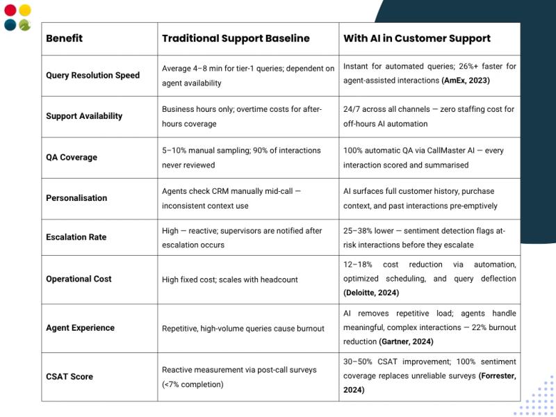 To really understand what AI customer support delivers, you have to compare it to how support actually works today, not an ideal version of manual operations, but the reality most contact centres operate in.