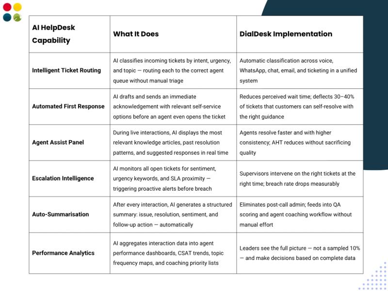 - An AI-powered helpdesk does much more than manage queues. It routes conversations, supports agents in real time, summarises interactions, scores performance, and learns continuously, all without relying on manual QA for most of the workload.