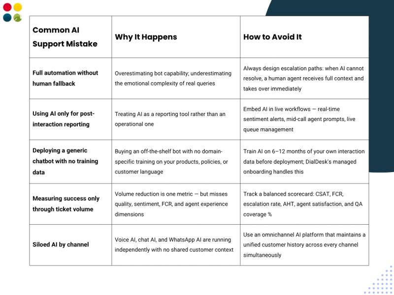 - There are a few common pitfalls to avoid, like over-automating without a fallback, using AI only after interactions, deploying generic bots, tracking the wrong metrics, or keeping AI limited to a single channel.