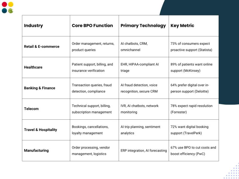 โข Banking and Finance BPO prioritises security, fraud detection, and compliance with AI biometrics and encrypted CRM as the technology foundation.
