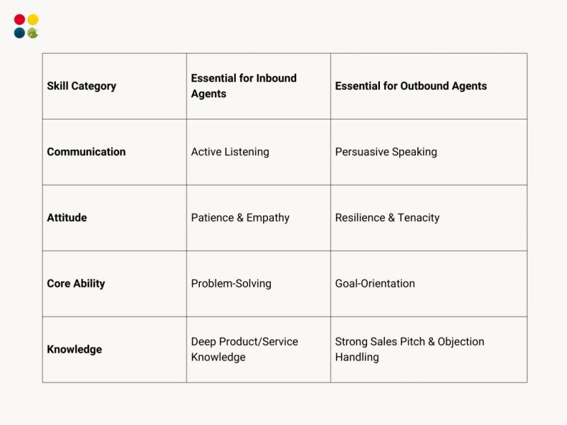 The skill sets for inbound and outbound agents, while overlapping, have distinct areas of focus tailored to their primary objectives. Successful teams require agents with the right aptitudes for their respective roles.