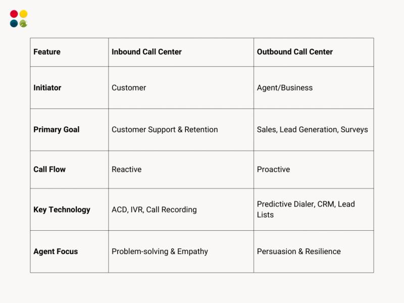 The core distinction lies in who initiates the call. Inbound calls are reactive — initiated by customers seeking assistance or information. Outbound calls are proactive — initiated by your agents to reach potential or existing customers.