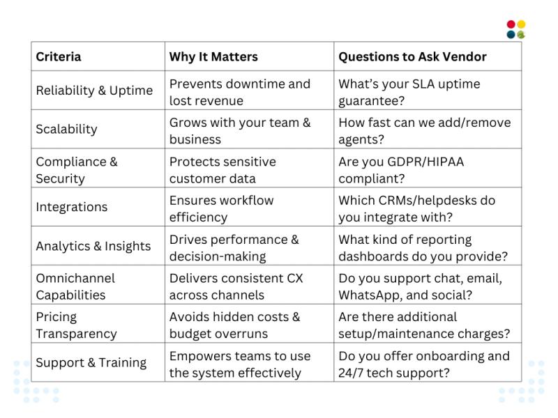 When comparing providers, consider uptime, scalability, compliance, integrations, analytics, omnichannel capabilities, price transparency, and support. These considerations don’t merely shape cost—they have direct repercussions on customer loyalty and business growth.